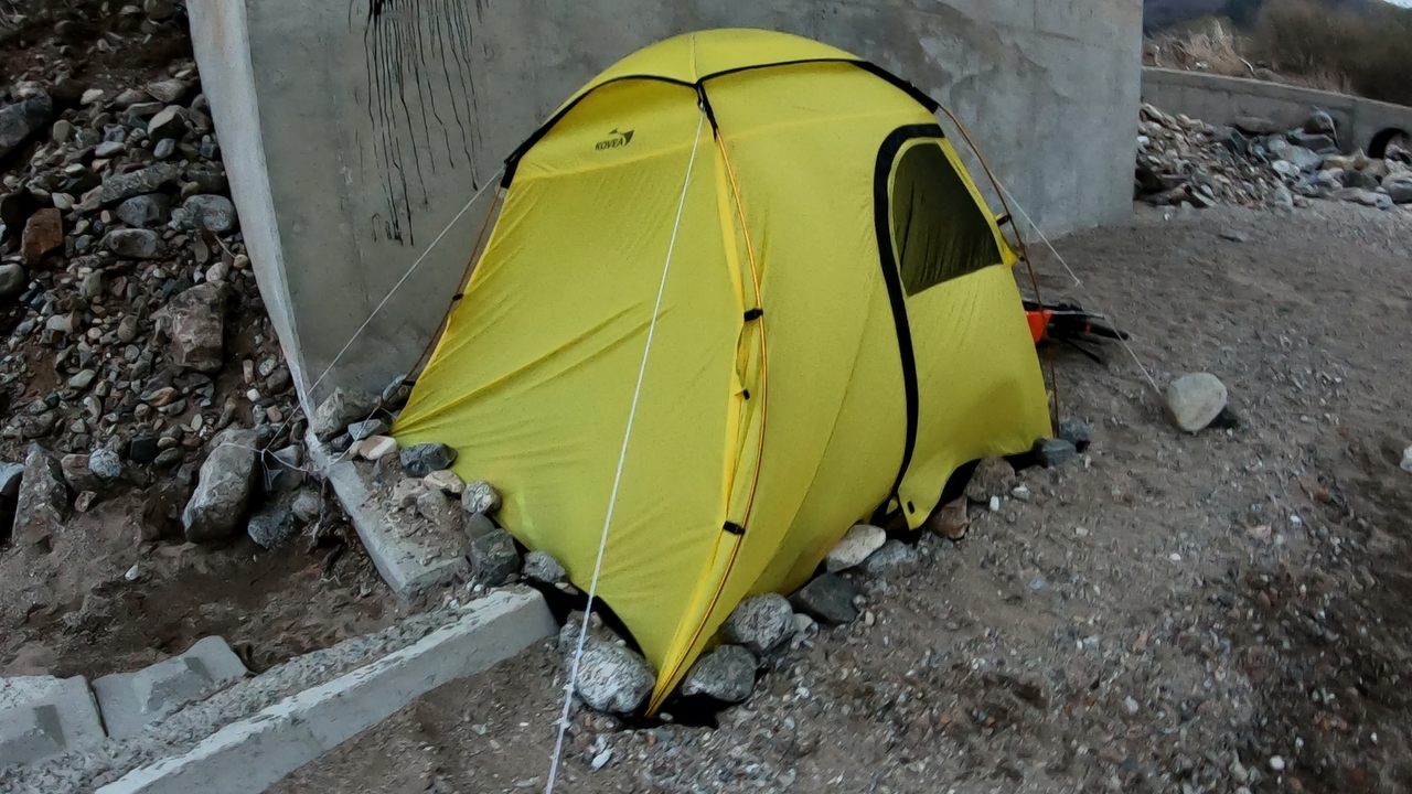 이렇게 하루 정말 힘들었던 고개를 넘다 보니 하루가 저물어 야영지를 구해야 했습니다. 내일은 비가 내린다는 예보를 듣고 다리 밑에서 하룻밤 야영을 하게 됩니다. 그러나 잠잠하던 바람이 새벽 3시부터 강풍으로 돌변해서 텐트를 압박하니, 견디다 못해 새벽부터 텐트를 철거해서 대피합니다.